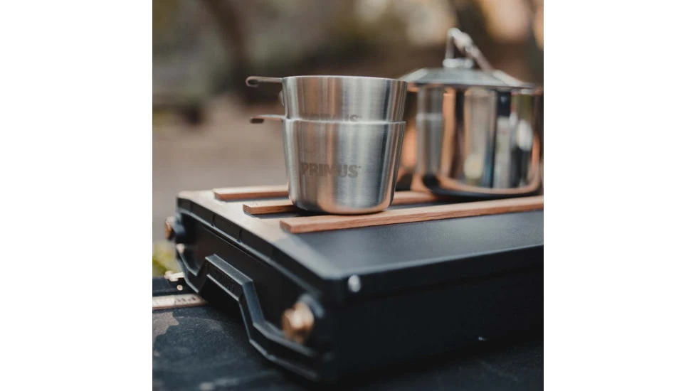The sleek die-cast aluminum body, oak laths and brass details upgrade the look of any campsite and will hold up to many years of use. The internal pot supports and drip tray are removable for easy cleaning. When storing, simply lock closed this slim-profile stove can be stashed almost anywhere