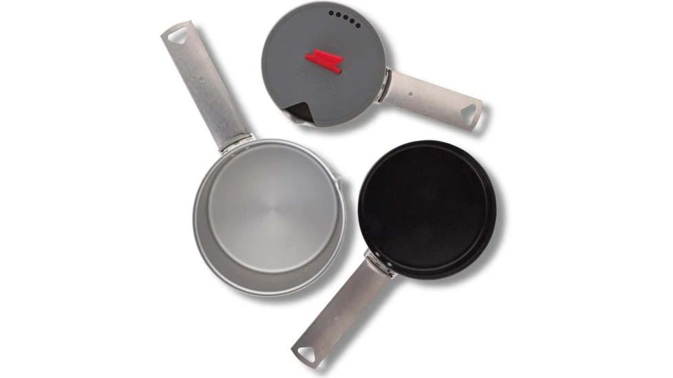 Boil water, for pasta or your freeze-dried meal, in either pot. The 0.6L size offers a lid with strainer and handle. The 1.0L includes the pot, a fry/pan lid with a non-stick ceramic coating, and two handles. Or bring everything with the Set, including 2 pots, a fry pan and three handles. All handles are removable and can be configured in numerous ways to make cooking easier or can secure everything together when packed.