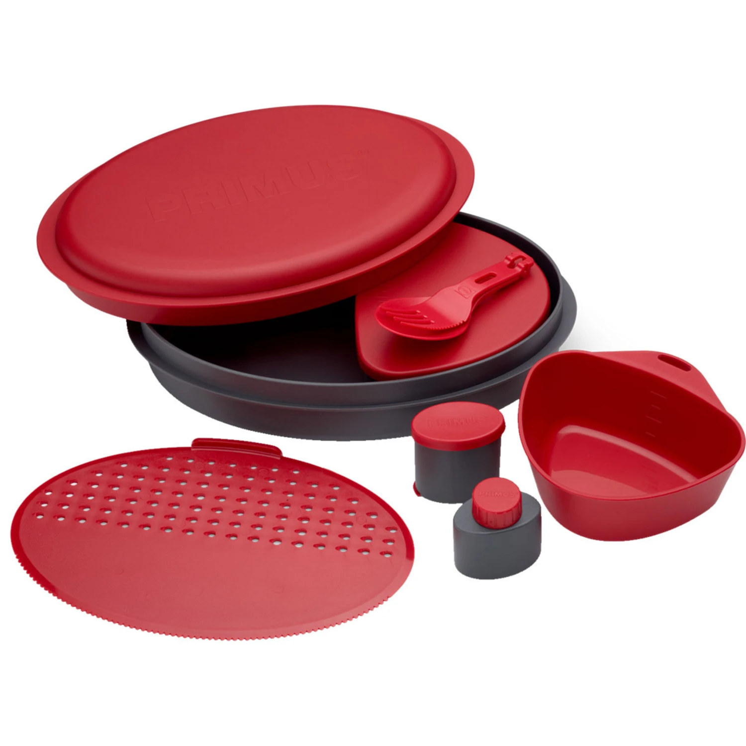 <p>The eight-piece Primus Meal Set includes everything you need to eat out in the great outdoors. Made from easy-to-clean, micro-wave and dishwasher compatible materials.</p><ul><li>Two deep plates<li>a spice jar with three compartments<li> a small container that can be used for oil or washing- up liquid<li>storage container with tight-fitting lid, <li>an outdoor cup, <li>folding spork<li> and an all-in-one cutting board that can be equally used as acolander, grater and knife<li>Available in three colours: Red, black and green</LI></UL> <P class=details>Weight: <STRONG>360g</STRONG> | Dimensions: <STRONG>230 x 145 x 60 mm |</STRONG> Material:<STRONG> polypropylene</STRONG></P>