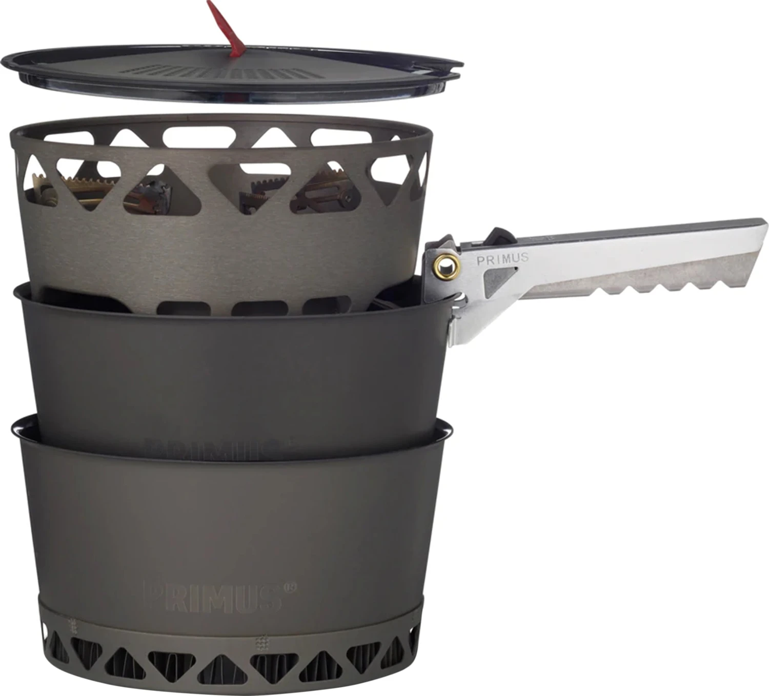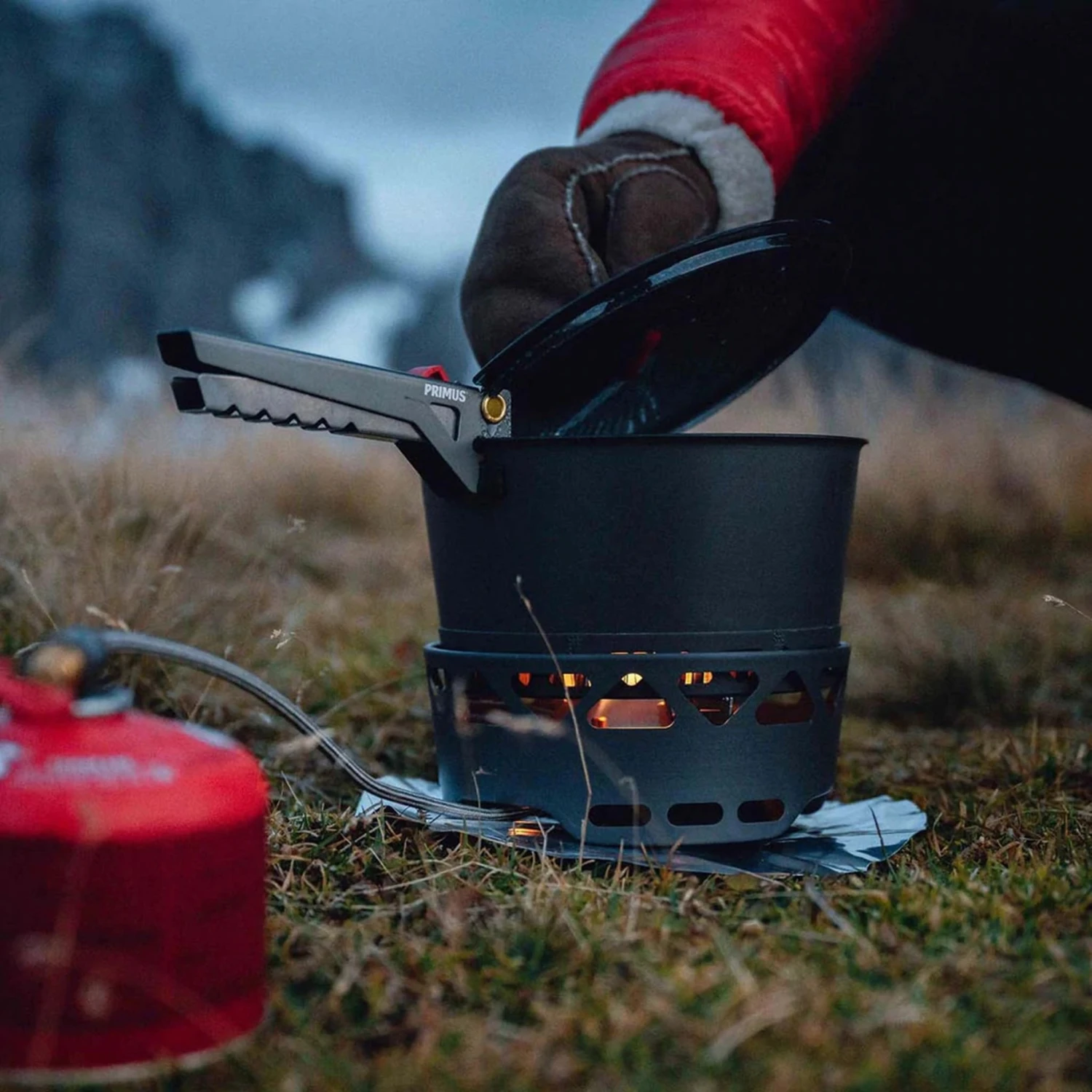 The PrimeTech Stove System is a unique multi-person all-in-one system that offers the most stable and windproof burner to satisfy the needs of the backpacking chef. This system contains everything a backcountry chef needs to prepare a wide range of foods for the crew while the regulated valve provides consistent power needed for a rolling boil, a slow simmer, and for everything in between. Set up your backcountry kitchen with ease. The remote-canister stove, placed on the foldable heat reflector, stands alone with a low center of gravity and can be lit with the independent t-grip Piezo igniter. Boil a liter of water for pasta with the steady 7000 BTU(2000W)flame in under four minutes, then use the integrated colander lid to drain. Stash the hot pot and pasta in the insulated storage bag while you use the ceramic, non-stick coated pot to fry up the veggies prior to adjusting the flame to simmer the sauce. Easily switch between handing the hot pots with the Crimp Pot Gripper. When you are ready to break down camp, simply nest all of the pots, parts and pieces into each other. Slide into the insulated storage bag for a clean, compact, and rattle-free camp kitchen. PrimeTech advanced technology improves heat-efficiency by combining an optimized burner, an integrated windscreen, and a pot with an integrated heat exchange. This reduces fuel consumption by almost 50%(compared to conventional stoves), meaning you get to carry less fuel-hence a lighter backpack and more environmentally friendly cooking. The stove system comes with an integrated Laminar Flow Burner and windscreen, two pots, a transparent lid with integrated colander, an independent t-grip Piezo igniter, a Crimp Pot Gripper, a padded/insulated storage bag and a foldable heat reflector.