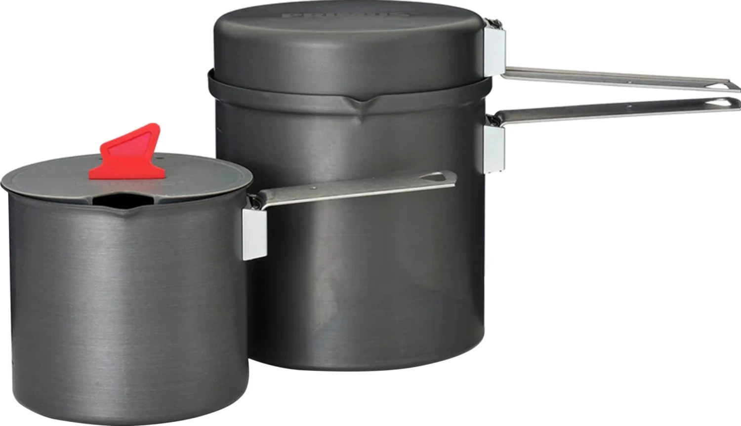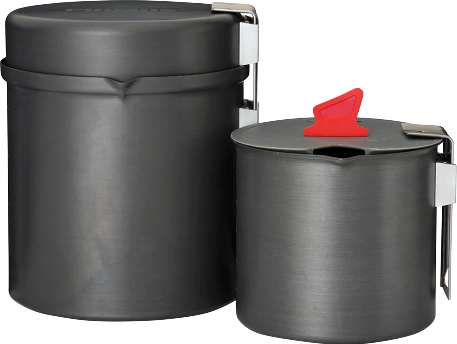The Trek Pots are the perfect backpacking pots created for outdoor chefs who want to take their cooking to the next level. These ultralight pots easily fit into your backpack and are perfect for backcountry cooking needs. Boil water, for pasta or your freeze-dried meal, in either pot. The 0.6L size offers a lid with strainer and handle. The 1.0L includes the pot, a fry/pan lid with a non-stick ceramic coating, and two handles. Or bring everything with the Set, including 2 pots, a fry pan and three handles. All handles are removable and can be configured in numerous ways to make cooking easier or can secure everything together when packed.