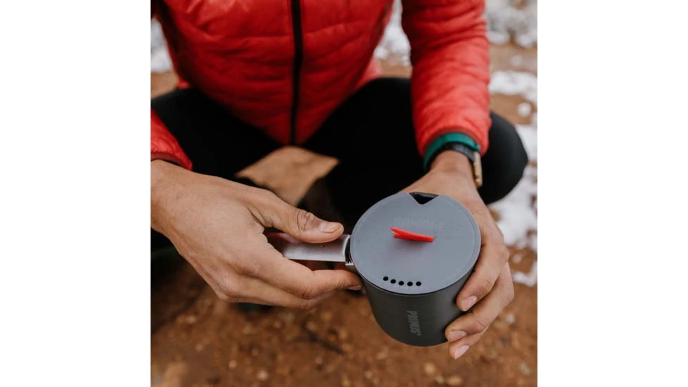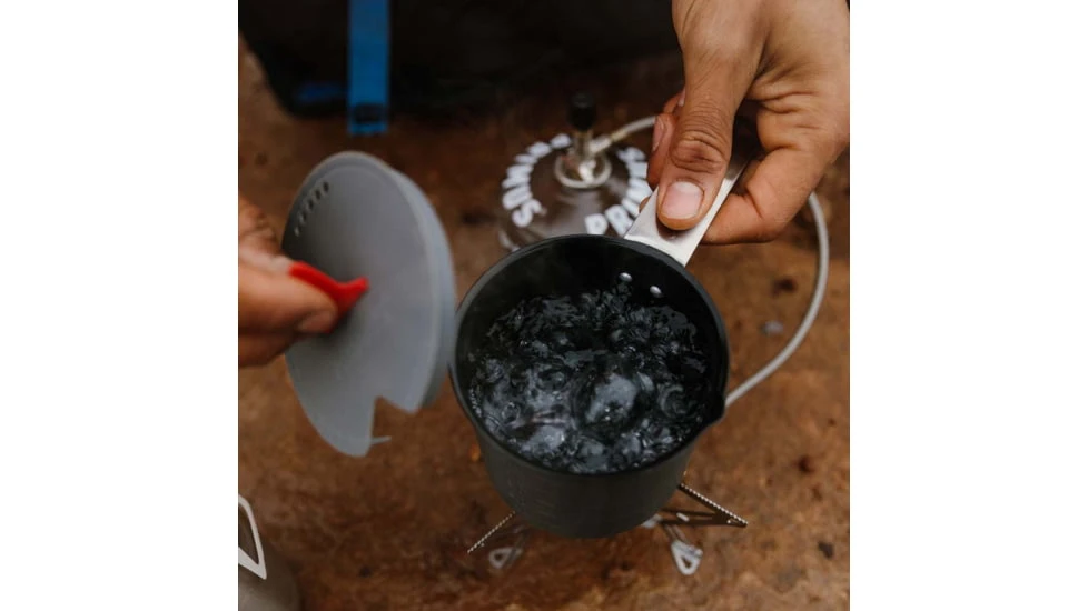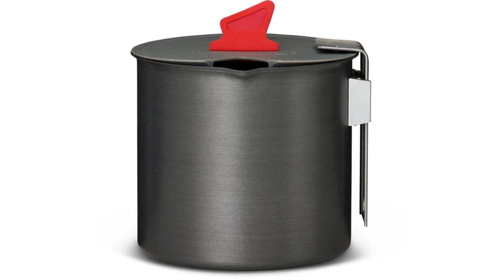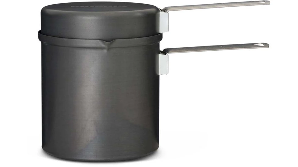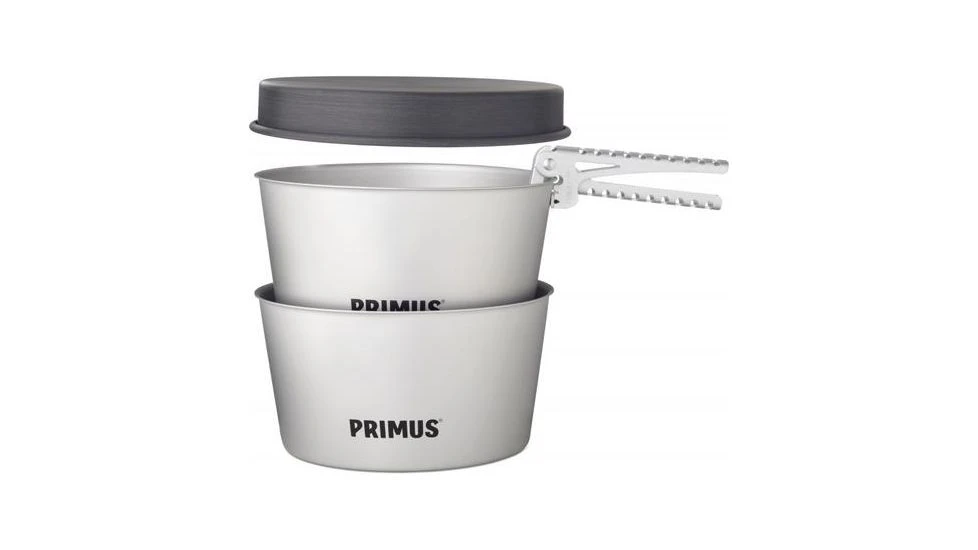 Both pots are made of aluminum, a lightweight material that also spreads the heat really well. The frying pan is made of hard anodized aluminum with a non-stick coating and also works as a lid. Two 2.3 liter aluminum pots that are easy to pack and suitable for 2-5 people. Includes storage bag and pot support.