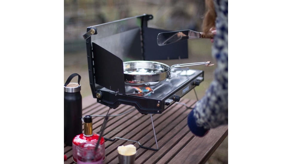 The foldable legs provide valuable additional table space while cooking, or opt for the lower ultra-stable option. Easily fire up either burner with the push button Piezo igniter. Each burner runs independently, allowing outdoor chefs to cook multiple pots at a wide range of temperatures, keeping the sauce slowly simmering and the water at a rolling boil from the 10,200 BTU (3000W) flame.In windy conditions, the lid and side windscreens ensure steady cooking.